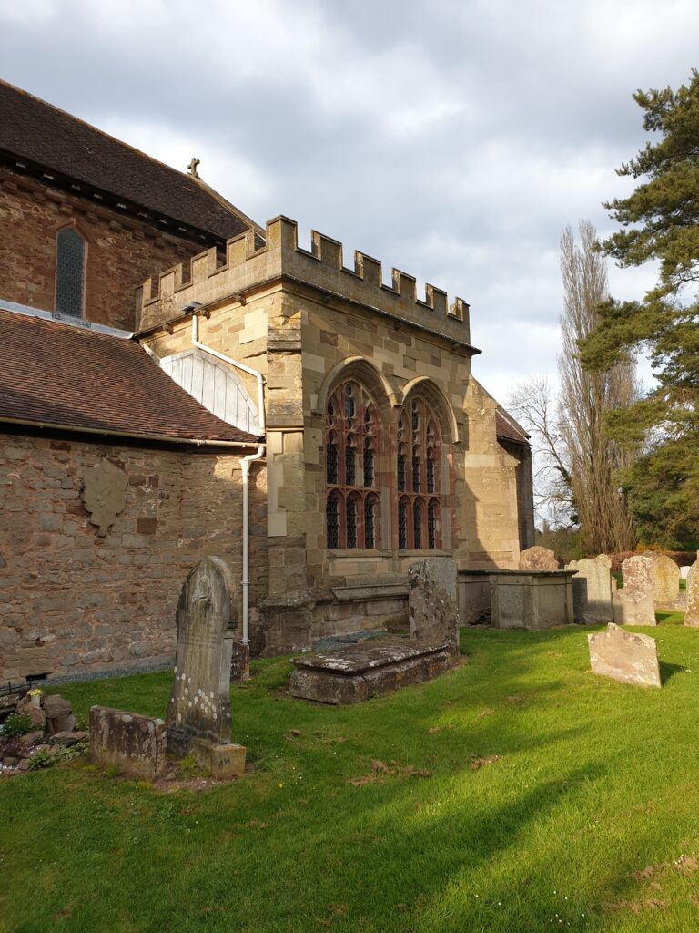 In 1503, after the bishops ceased using the palace, it was leased to Thomas Morton, Archdeacon of Hereford, and his brother Sir Rowland, newly arrived in Bosbury.  There were said to have been brothers (but are more likely to have been nephews) of the celebrated Cardinal John Morton.  As Archbishop of Canterbury (1482-1500) he had been responsible for the great central tower (“Bell Harry”) there.  The Morton chantry chapel was formed in the south aisle of Bosbury church in order that masses might be said in perpetuity for the soul of Sir Rowland’s wife who died in 1528.  With the large Perpendicular windows and rich fan vaulting it draws its details from “Bell Harry” and also from Bishop Stanbury’s chapel in Hereford Cathedral for which Thomas had been responsible, and it concedes nothing to the simple Transitional church with which it can only be said to have collided.