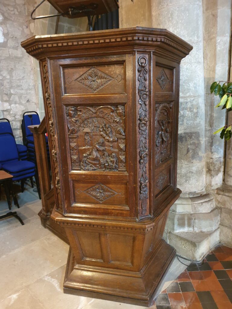Early in the seventeenth century the church gained its present lectern and pulpit, both Jacobean in style. The pulpit has been greatly changed and restored, but its carvings of Biblical themes are believed to date from the late sixteenth century.