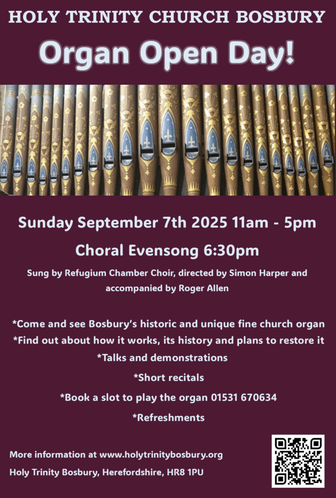 Everyone is welcome at our Organ Day choral evensong on Sunday 7th September at 6:30pm. This service is sung by Refugium Chamber Choir, directed by Simon Harper and accompanied by Roger Allen, and will include music by Charles Wood, Charles Villers Stanford, Humphrey Clucas, Esther Kay (Bosbury’s Director of Music!) and Gerald Finzi!