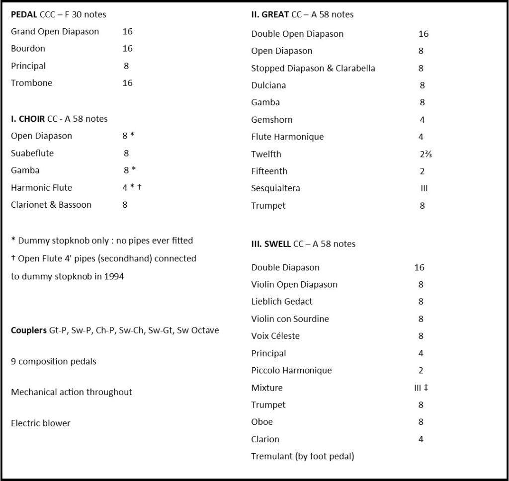 There are three manuals and pedals with 29 speaking stops. Mechanical action is employed. Pipework is of a high standard and gives a full, bright tone.